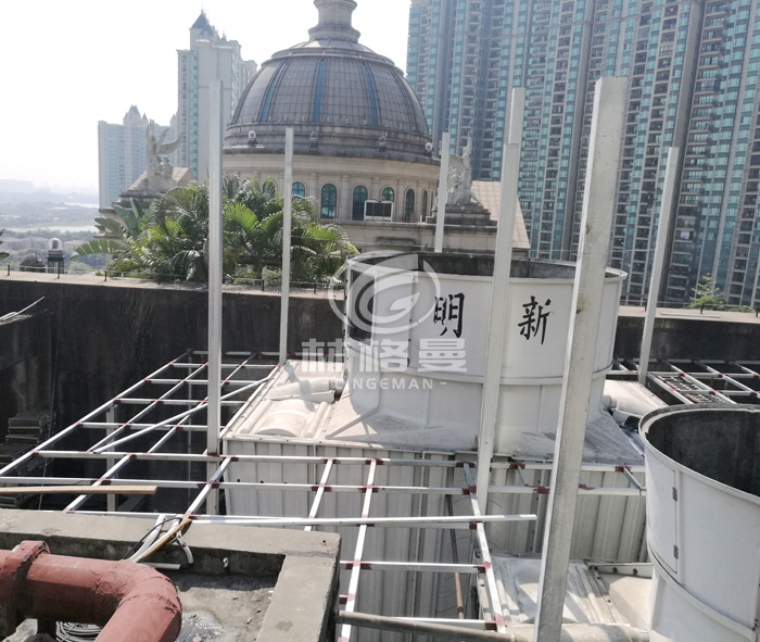 (1)為了防止上半部風(fēng)扇噪聲向高層周邊傳播。冷卻塔需安裝具有隔聲、消聲、吸聲、通風(fēng)散熱、設(shè)備檢修方便為一體的排風(fēng)消聲系統(tǒng)。其上半部排風(fēng)消聲系統(tǒng)主要包括:消聲靜壓箱、排氣消聲器、可拆卸檢修活動(dòng)板等。