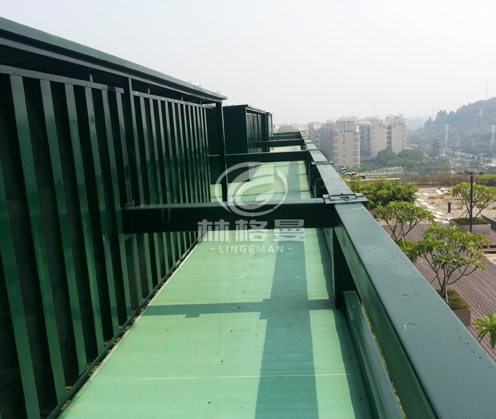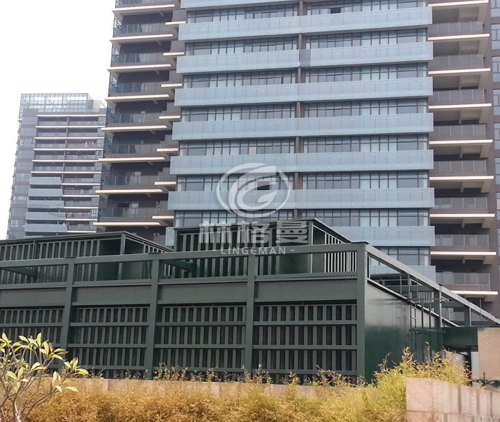 (2)罩體下部進(jìn)風(fēng)消聲系統(tǒng)主要包括:進(jìn)氣消聲器、可拆卸檢修活動(dòng)版、復(fù)合隔聲層、防雨百葉、檢修消聲通道及隔聲門(mén)等。為了防止下半部落水噪聲向低層居民住宅傳播。冷卻塔下半部分安裝具有隔聲、消聲、吸聲、通風(fēng)散熱、設(shè)備檢修方便的進(jìn)風(fēng)消聲系統(tǒng)。罩體下部?jī)蓚?cè)均加裝進(jìn)風(fēng)消聲器,消聲器消聲片長(zhǎng)度西側(cè)900mm,東側(cè)臨街部分消聲片長(zhǎng)500mm,消聲片統(tǒng)一厚度 100mm以降低進(jìn)風(fēng)噪聲; 消聲量因消聲片長(zhǎng)度而定。