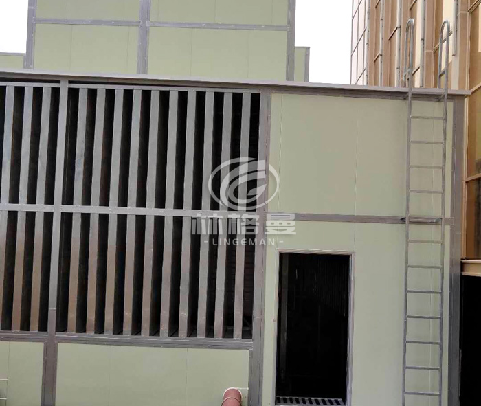 (1)為了防止上半部風(fēng)扇噪聲向高層周邊傳播。冷卻塔需安裝具有隔聲、消聲、吸聲、通風(fēng)散熱、設(shè)備檢修方便為一體的排風(fēng)消聲系統(tǒng)。其上半部排風(fēng)消聲系統(tǒng)主要包括:消聲靜壓箱、排氣消聲器、可拆卸檢修活動板等。