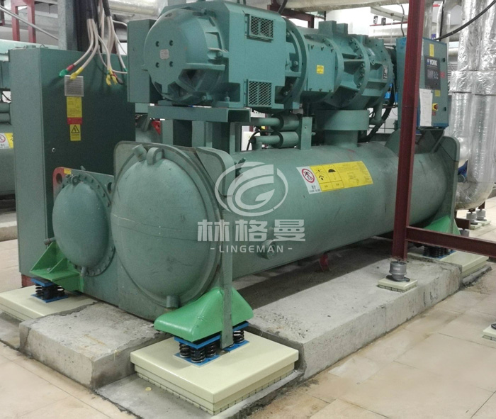 這樣可使空調(diào)主機運行時振動源在最近距離內(nèi)給予減弱,降低傳給冷凍主管的振動,彎頭至空調(diào)主機段主管安裝彈簧減振器支承。