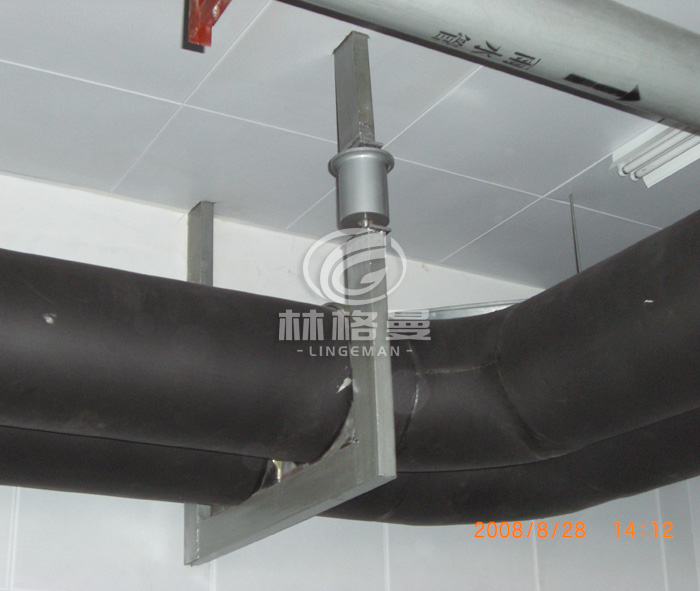 這樣可使空調(diào)主機(jī)運(yùn)行時(shí)振動(dòng)源在最近距離內(nèi)給予減弱,降低傳給冷凍主管的振動(dòng),彎頭至空調(diào)主機(jī)段主管安裝彈簧減振器支承。