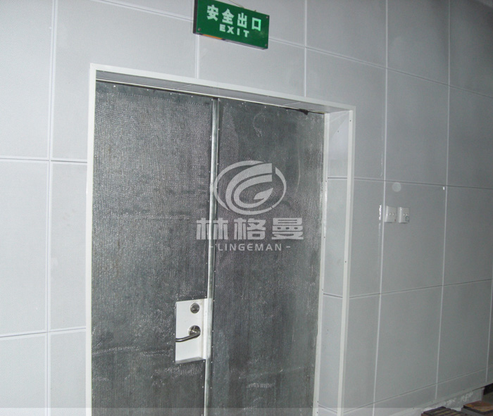 空調(diào)機(jī)房門(mén)改造成隔音密封門(mén),全鋼架結(jié)構(gòu),內(nèi)充50kg/m3吸音棉,夾雙層玻璃布,外面以沖孔鍍鋅鐵飾面皮,使用∠40角鋼固定。
