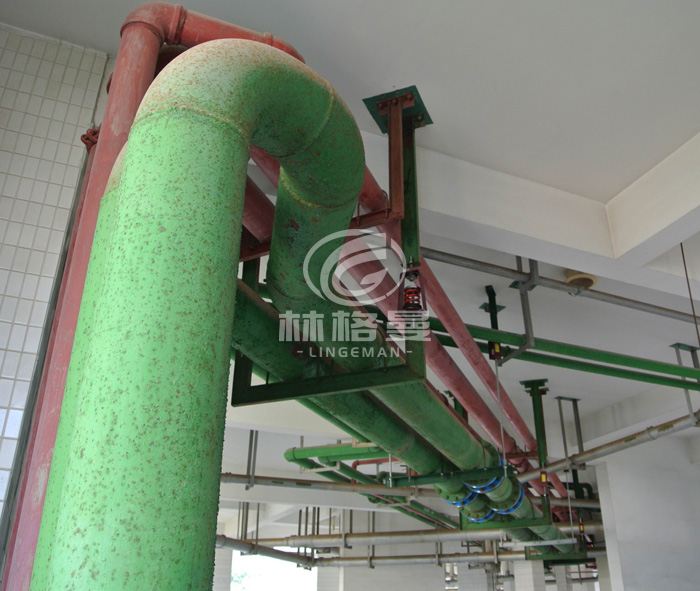 這樣可使空調(diào)主機(jī)運(yùn)行時(shí)振動源在最近距離內(nèi)給予減弱,降低傳給冷凍主管的振動,彎頭至空調(diào)主機(jī)段主管安裝彈簧減振器支承。